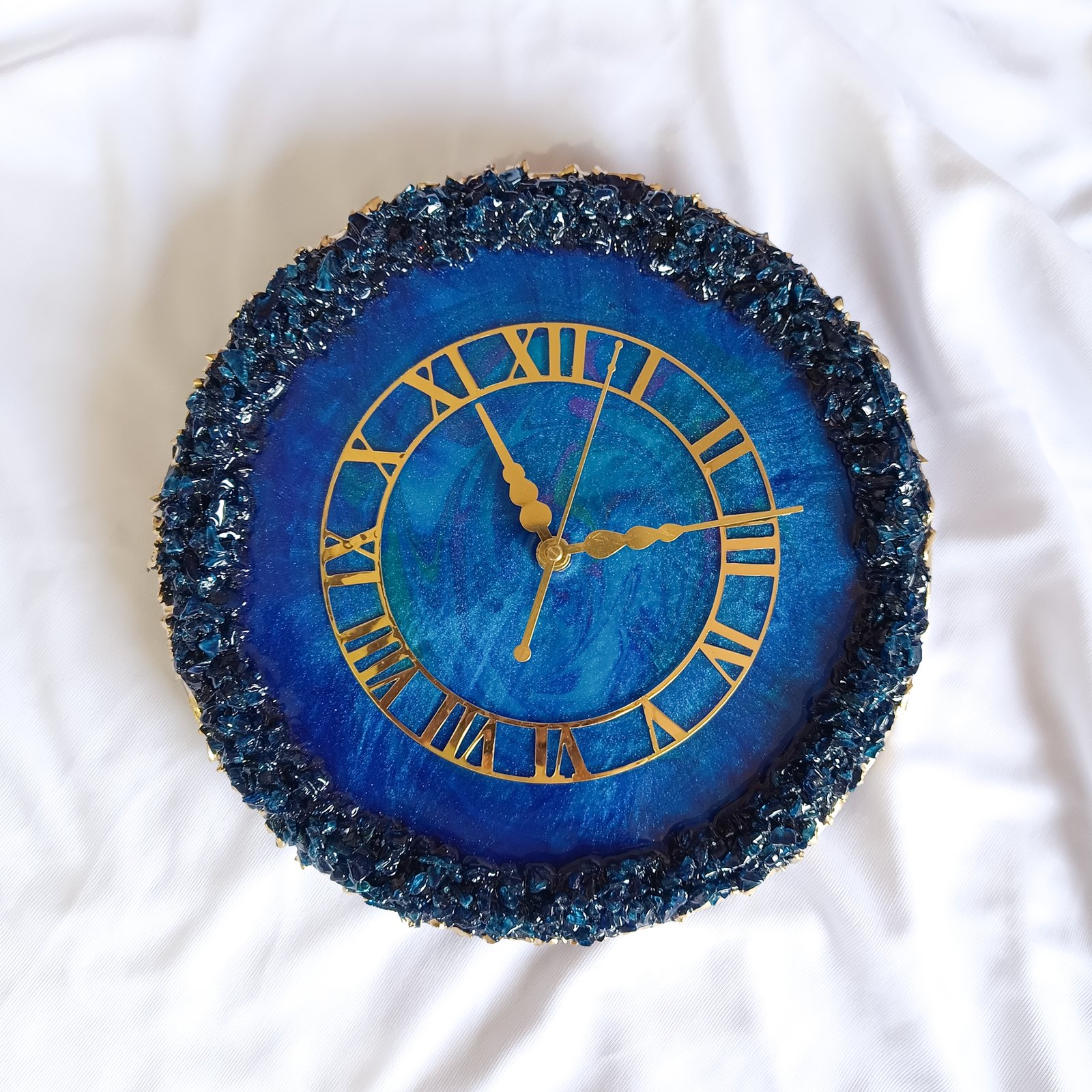 Elevate your home décor with this stunning Resin Wall Clock, crafted in a rich deep blue shade that brings calmness and elegance to any space. The clock is beautifully bordered with shimmering stone accents, adding a luxurious and artistic touch.